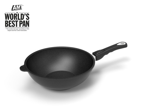 Patelnia WOK AMT Gastroguss pozwoli Ci docenić na nowo szybkie smażenie w gorącym tłuszczu. Wysokie, wyprofilowane ścianki patelni zapewnią doskonałą cyrkulację gorącego powietrza. Aluminiowy korpus pokryty nieprzywierającą powłoką to duet przetestowany przez najbardziej wymagających użytkowników: szefów kuchni i uczestników międzynarodowych, kulinarnych konkursów. Dzięki patelni typu WOK sprawnie przygotujesz kultowe dania kuchni azjatyckiej – aromatyczne potrawy stir fry i mięso smażone na gorącym tłuszczu.