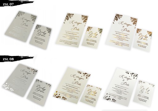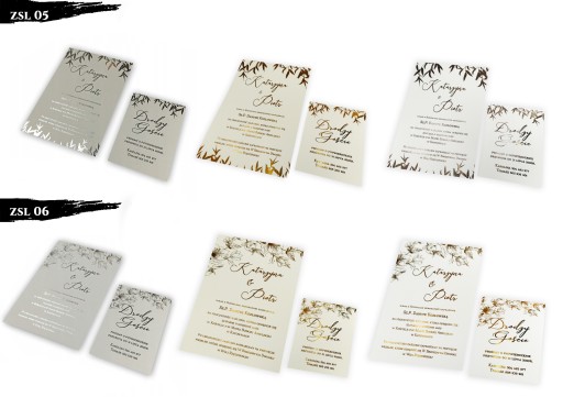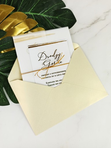 - zaproszenia jednostronne na sztywnym papierze ze złoconym tekstem na zaproszeniu oraz bileciku