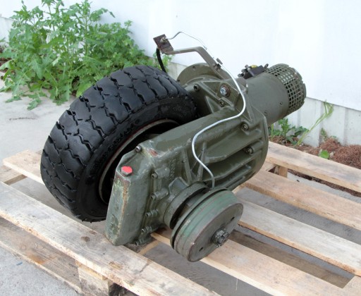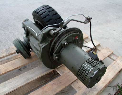 Oferuję Państwu moduł napędu wózka widłowego składający się z silnika napędowego, przekładni wraz z kołem jezdnym i hamulcem.