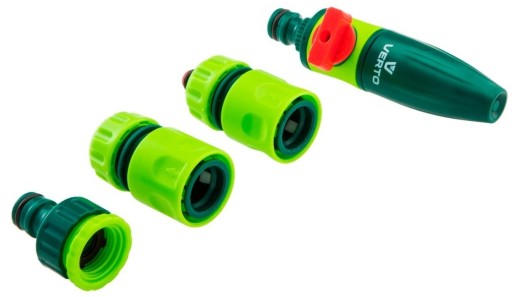 Zestaw składa się z 4 elementów: zraszacz prosty z blokadą wypływu wody, złączka przelotowa 1/2", złączka stop 1/2", przyłącze do kranu 1/2".