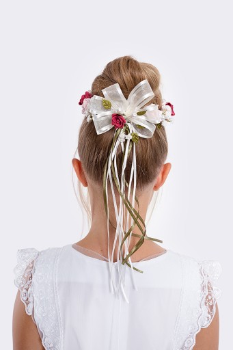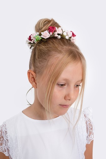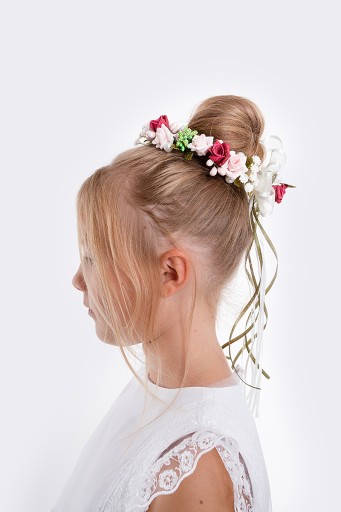 Winek komunijny na koczek należy do kolekcji wianki jak żywe od kwiaciarki. Wspaniale prezentuje się na każdej dziewczynce niezależnie od wybranej stylizacji koka.