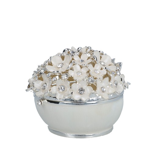 Pełna uroku szkatułka puzderko na biżuterię. Wykonana z metalu w kolorze srebrnym, w celu zapewnienia długoletniej ochrony metalu w całości platerowana. Posiada piękne zdobienia błyszczącymi się kamykami i imitacją masy perłowej na wierzchu wieczka. Spód puzderka jest w całości wykonany z imitacji masy perłowej. Szkatułka puzderko świetnie posłuży do przechowywania różnego rodzaju kobiecych drobiazgów. Produkt wykonany bardzo estetycznie i z dbałością o wykończenie szczegółów.