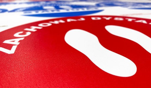 Naklejka jest pokryta laminatem antypoślizgowym (wysoka odporność na zmywanie, ścieranie, szuranie, wytrzyma ruch o dużym natężeniu).