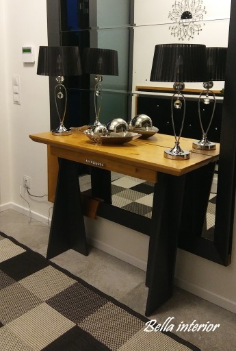 Blat fornirowany naturalnym fornirem w kolorze olchy z jedną, pojemną szufladą ozdobioną kryształowym uchwytem oraz oryginalnymi nogami wykonanymi z płyty MDF malowanymi w kolorze grafitowym.
