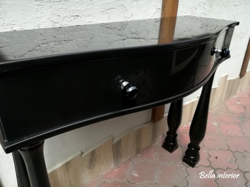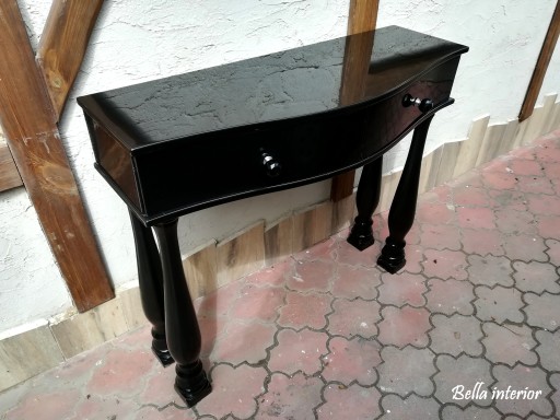 Oferujemy Państwu wysokiej jakości niepowtarzalną konsolę w kolorze czarnym, lakierowaną na wysoki połysk z dwoma szufladami ozdobionymi kryształowymi gałkami. To co ją wyróżnia spośród innych to przepięknie toczone nogi. Będzie idealna do wnętrz urządzonych zarówno w tradycyjnym stylu jak i w nowoczesnym.