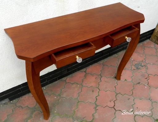 Oferujemy Państwu wysokiej jakości niepowtarzalną konsolę. Fornirowaną naturalnym fornirem w kolorze wiśni antycznej z dwoma szufladkami ozdobionymi kryształowymi uchwytami ze złotym wykończeniem. Będzie idealna do wnętrz urządzonych zarówno w tradycyjnym stylu jak i w nowoczesnym.
