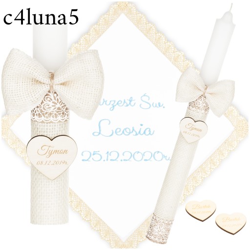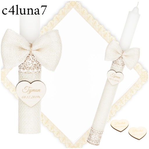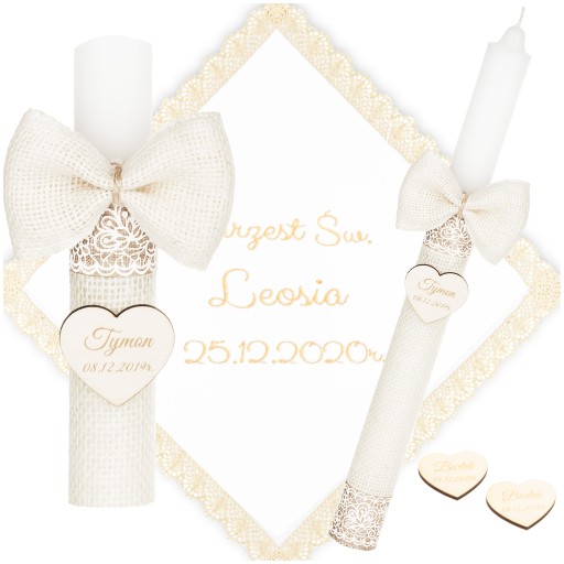 Świeca na chrzest jest owinięta delikatnym materiałem jutowym, co nadaje jej rustykalny, boho charakter. Ozdobiona jest opaskami, które podkreślają jej wyjątkowy styl. Co więcej, do świecy przymocowana jest urocza jutowa kokarda oraz zawieszka w kształcie serca, na której możemy dla Ciebie wygrawerować imię i datę chrztu, aby uczynić tę pamiątkę jeszcze bardziej osobistą.