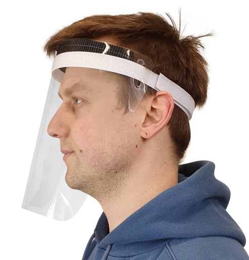 - Przyłbica jest wykonanaz bezbarwnego lekkiego materiału odpornego na środki dezynfekujące na bazie alkoholi. Szybka wykonana z poliwęglanu