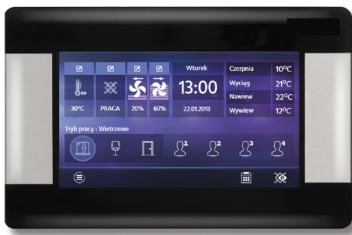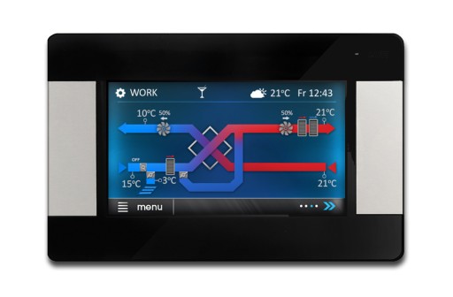 •płynnie sterują pracą wentylatorów nawiewu i wywiewu zapewniając wysoką sprawność odzysku ciepła oraz wymianę powietrza w pomieszczeniach w oparciu o zaprogramowane harmonogramy lub w sterowaniu ręcznym
