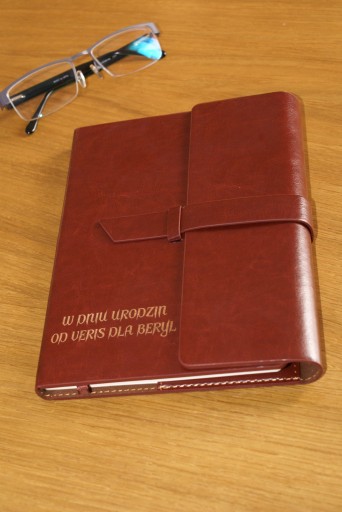 Elegancki notes formatu A5 w klasycznej okładce wykonanej z ekoskóry. Notes zawiera 80 kartek w linie oraz praktyczną wstążeczkę - zakładkę. Wewnątrz okładki miejsce na 3 wizytówki, długopis (jest w komplecie) oraz pamięć USB (brak w komplecie). Okładka nie jest umocowana na stałe do bloku notesu, tylko nasuwana na pierwsze kartki, co daje możliwość wymiany notesu. Notes zamykany za pomocą paska z ekoskóry. Na okładce wykonujemy grawer według Twoich informacji. (przed wykonaniem możemy zrobić projekt)