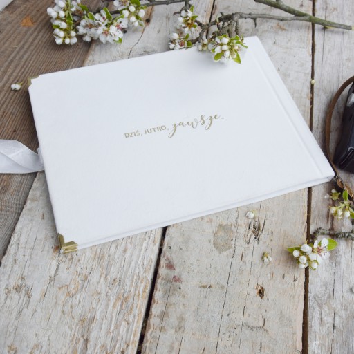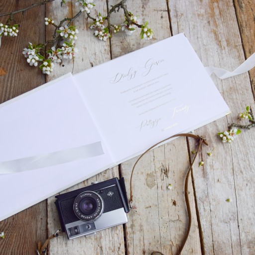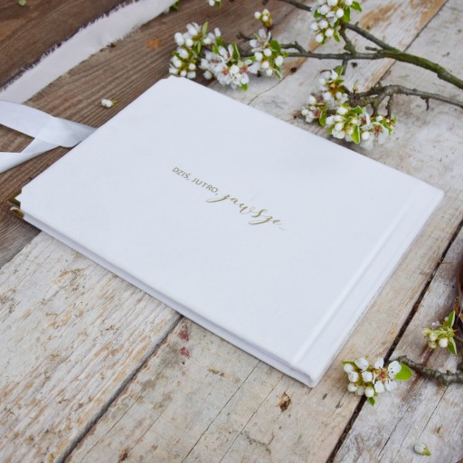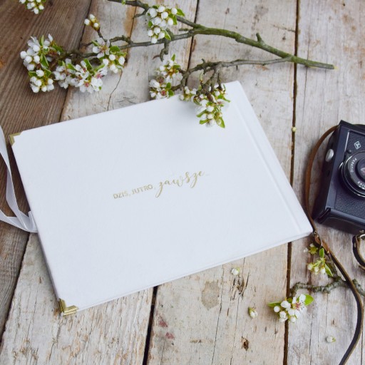 Elegancka biel jest hitem ostatnich lat na weselach, dlatego mamy dla Was wyjątkową ofertę. Personalizowana Księga Gości, która wpisze się w styl każdego wesela. Welurowa okładka, złocone napisy, piękna wstążeczka i kartki czekające na słowa Waszych gości.