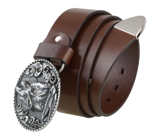 Brązowy gładki pasek to połączenie stylu elegancji i swobody w którym odnajdzie się zarówno płeć męska jak żeńska. Pasek jest wyposażony w klamrę pełną z motywem głowy wilka oraz metalową końcówkę co dodaje mu oryginalności i niepowtarzalności wzoru. Idealny dla fanów dwóch kółek i nie tylko.