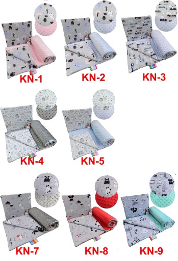 Kocyk jest dwustronny. Z jednej strony jest tkanina bawełniana ( za wyjątkiem pikowanej w gwiazdki - poliester) a z drugiej bardzo milutka i cieplutka w dotyku dzianina VELVET o splocie cegiełki lub MINKY z wytłoczeniem w bąbelki. Wewnątrz jest ocieplacz odzieżowy o gęstości 120g/m2- kocyk i 400g/m2 podusia
