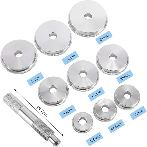 Zestaw składa się z aluminiowych dysków o średnicy od 40 do 81 mm oraz rękojeści mocowanej w każdym z dysków.