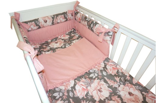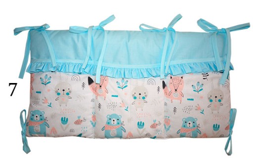 Mocowany jest przy pomocy górnych i bocznych troczków. Można go zamontować w dowolnym miejscu łóżeczka.