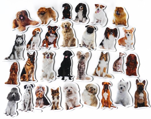 Magnesy na lodówkę RASY PSÓW, to komplet 30 sztuk, wyciętych po konturze, zwierzątek przy użyciu robionych na zamówienie wykrojników. Magnesy uczą, dziecko rozpoznawać rasy psów. Magnesy wzmacniane są 1,5 mm tekturą, dzięki której łatwiej jest magnes chwycić w rączkę, zapakowane w kartonik, idealne na prezent.