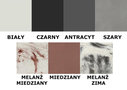 - Dostępne w 7 kolorach: biały, czarny, szary, antracyt, miedziany, melanż zima, melanż miedziany