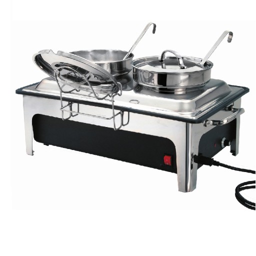 Stacja elektryczna na zupę z 2 kociołkami o pojemności 4 l każdy. Urządzenie wykonane ze stali chromowo-niklowej. Pojemnik na wodę wykonany z tworzywa sztucznego w kolorze czarnym.