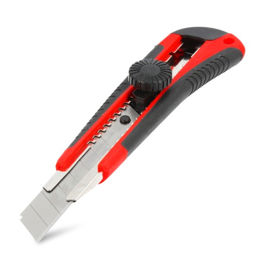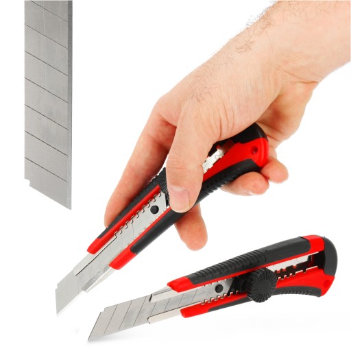 Dodatkowe funkcje takie jak blokada czy możliwość wsunięcia noża w oprawkę zapewniają bezpieczną pracę. Dodatkowo, nóż jest wyjątkowo wygodny i dobrze leży w dłoni. Miękkie gumowe boki zapobiegają wyślizgiwaniu się narzędzia podczas pracy.