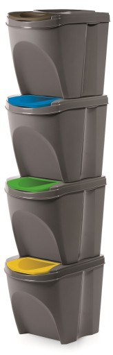 Cztery pojemniki jednokomorowe przeznaczone do zbiórki segregowanych odpadów. Świetnie sprawdzają się zarówno w domach jak i w firmach, a także w różnego rodzaju miejscach użyteczności publicznej jak szkoły, uniwersytety, urzędy. Wykonane z wysokiej jakości tworzywa sztucznego. Wyposażone w kolorową pokrywę z otworem umożliwiającą łatwe wrzucanie odpadów.