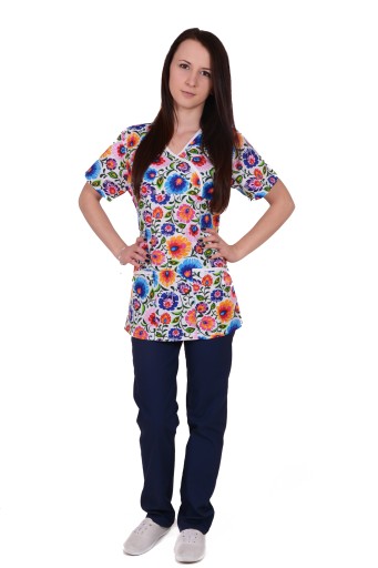 Bluza wykończona pod szyją naszywany na siebie V-neck, rękaw krótki. Dwie dolne, pojemne kieszenie. Spodnie klasyczne, na pasku z guzikiem typu NAP i rozporkiem.