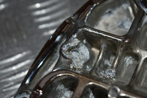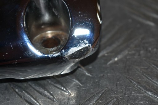 Set używany, posiada nieduże przytarcie, uszkodzoną powłokę chromu oraz wyrwane jedno gniazdo mocowania, uszkodzenia widoczne na zdjęciach.
