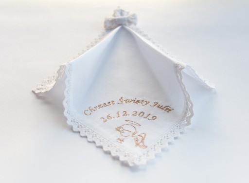 Szatka/chrzczonka uszyta z białej bawełny, obszyta białą koronką bawełnianą, w rogu wyhaftowany beżową nitką aniołek i napis Chrzest Święty oraz imię (imiona) dziecka i data chrztu. W przeciwległym rogu mała zakładka i naszyta ręcznie robiona, koronkowa kokardka.