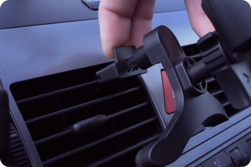 Na głównym panelu uchwytu znajduje się przycisk, który pod wpływem ciężarku telefonu powoduje zaciśnięcie się ramion na urządzeniu gwarantująć taki sam, mocny chwyt za każdym razem.