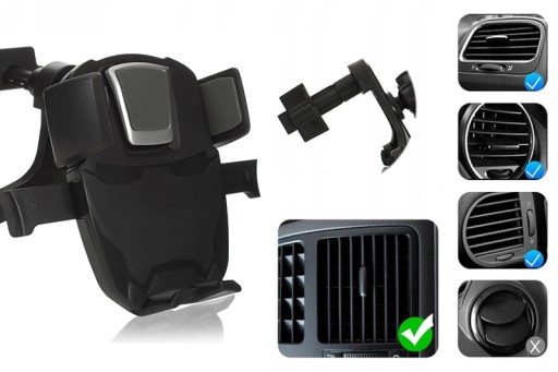 Dzięki swojej konstrukcji uchwyt pasuje do prawie każdego rodzaju kratki nawiewu. Przykładowe możesz zobaczyć na zdjęciu obok.