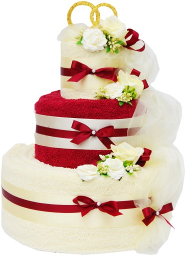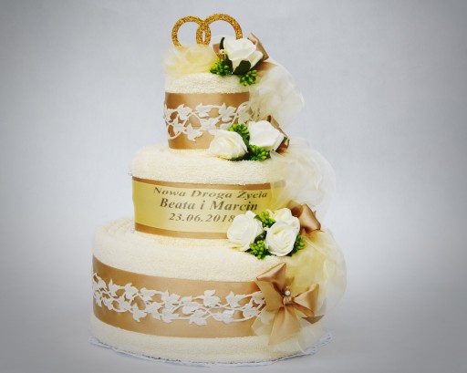 .Zapraszamy do zakupu oryginalnego i eleganckiego prezentu jakim jest tort z ręczników. To doskonały prezent na ślub, rocznicę ślubu, urodziny, podziękowania dla rodziców. Doskonały, jako dodatek do "koperty" i prezent zamiast kwiatów. Tort z ręczników jest tak piękny jak bukiet, ale będzie cieszył oko dłużej. To bardzo ładny i równocześnie praktyczny prezent. Po jego rozwinięciu obdarowani będą się cieszyć miękkimi, grubymi i chłonnymi ręcznikami.