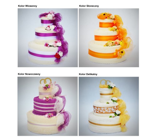 Każdy tort możemy wykonać w dowolnej kolorystyce ręczników - paleta kolorów dostępna poniżej oraz dodać dowolny dodatek na górę tortu.