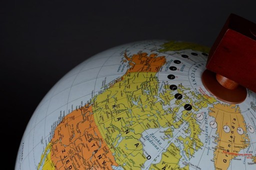 Wyłączony globus prezentuje kartografię polityczną, z państwami oznaczonymi osobnymi kolorami, miastami i siecią rzeczną. Oceany, morza i jeziora oznaczone kolorem jasnoniebieskim.