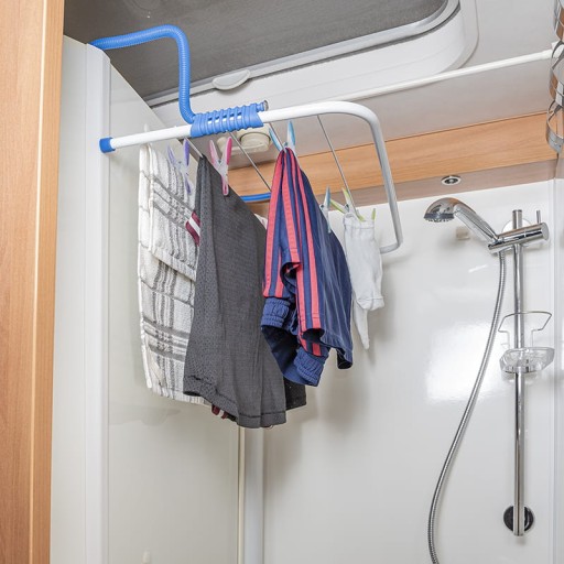 Suszarka, która idealnie nadaję się do kampera i przyczepy kempingowej. Wygodne mocowanie na oknie bocznym lub pod prysznicem.