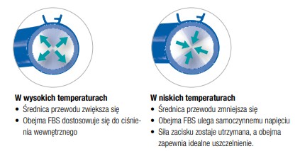- Dzięki swoim dynamicznym właściwościom sprężystym, obejmy NORMACLAMP® FBS do przewodów giętkich są idealnym wyborem w przypadku układów z króćcami narażonymi na działanie dużych wahań temperatury. Po zamontowaniu, obejmy NORMACLAMP® FBS zapewniają utrzymanie efektu samoczynnego napięcia przez dłuższy czas. Mechanizm ten, nawet w niskich temperaturach, zapewnia utrzymanie dostatecznie dużej, promieniowej siły zacisku, która gwarantuje doskonałą niezawodność uszczelnienia. Stosując obejmy NORMACLAMP® FBS, nawet przewody narażone na znaczne wahania temperatury lub ulegające tzw. „pełzaniu” mogą zostać bezpieczenie połączone.