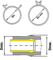 - Porównać Dmax. ze średnicą minimalną (D0 min.) podaną dla otwartej obejmy i dobrać odpowiedni produkt. D0 min. ≥ Dmax.