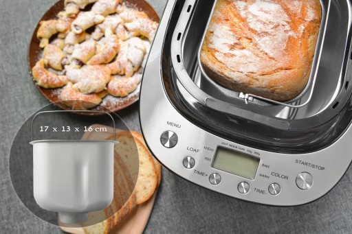 Dzięki temu urządzeniu nigdy nie dopadnie Cię nuda w kuchni! Za każdym razem możesz przygotować zupełnie inny rodzaj chleba, wybierając Twoje ulubione dodatki! Sprawdź tylko, czy istnieje możliwość ich zastosowania zgodnie z instrukcją i eksperymentuj. W zestawie znajdziesz kubek z miarką o pojemności 240 ml, praktyczną łyżeczkę do odmierzania składników oraz haczyk ułatwiający wydobycie szpatułek po zakończonym procesie pieczenia.