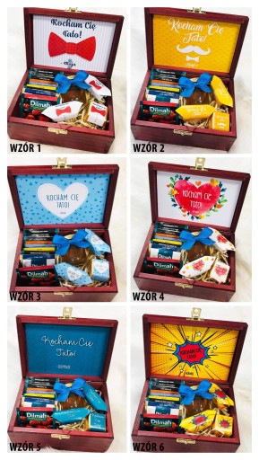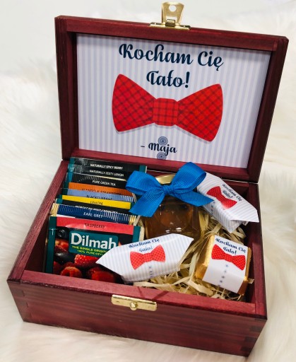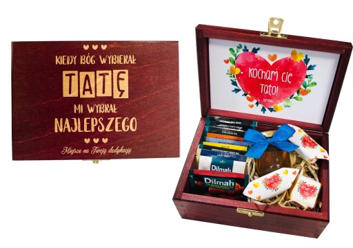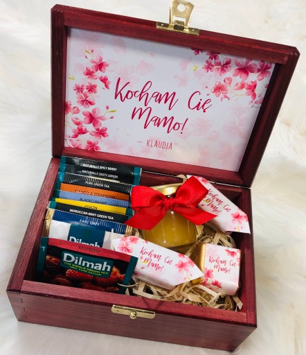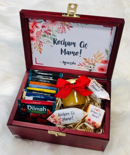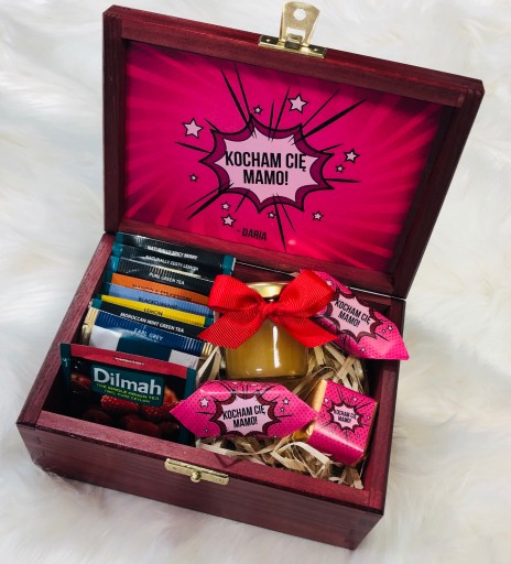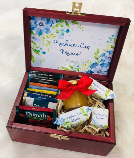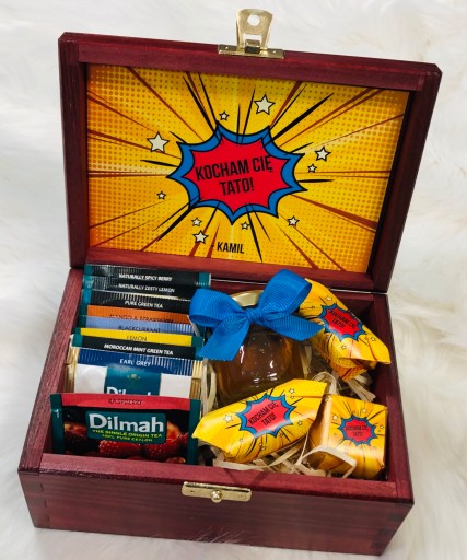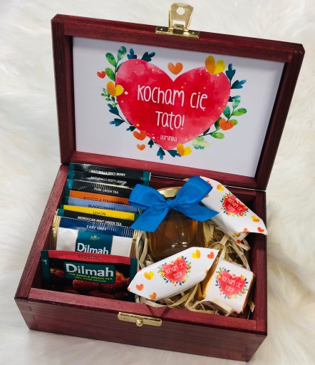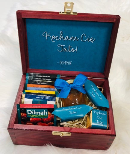 Zestaw Lux w drewnianym pudełeczku to 9szt. mix herbat Dilmah , Miodek w słoiczku 40g ,2 duże krówki oraz czekoladka.Napisy na wieczku wykonamy metodą graweru laserowego. Wymiary ok. 170x120x80mm. Pod wiekiem umieścimy Twój dowolny podpis. Numery wzorów graweru na wieczku i wnętrza oraz podpisy prosimy umieścić w uwagach do zamówienia. Ważność słodyczy min. 3 mies. od momentu wysyłki zamówienia do Klienta. Cena za 1 pudełeczko z zawartością.