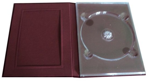 - Po lewej stronie etui bordowa ramka na zdjęcie 10x15 cm, po stronie prawej dwie tacki na płyty CD/DVD