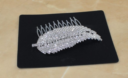 Grzebień ślubny z ozdobą w postaci lekko wygiętego liścia, mocno wysadzanego cyrkoniami. Stroik doda każdej fryzurze uroku. Korona na grzebieniu bardzo dobrze się utrzymuje. Cyrkonie mienią się jak diamenciki.