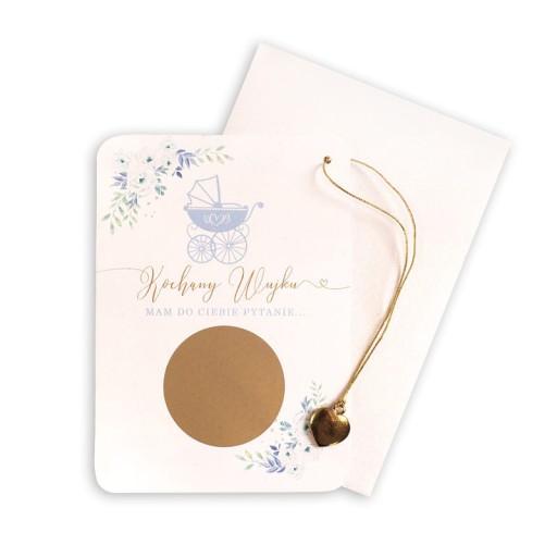 - Kartkę dekoruje grafika błękitnego wózka oraz kolorowych kwiatów, między którymi znajduje się zwrot do wujka: Kochany Wujku. MAM DO CIEBIE PYTANIE... Tajemnicze pytanie jest ukryte pod zdrapką, którą należy usunąć za pomocą zawieszki w kształcie serduszka. Po usunięciu zdrapki znajduje się pytanie: Czy zostaniesz moim tatą chrzestnym?