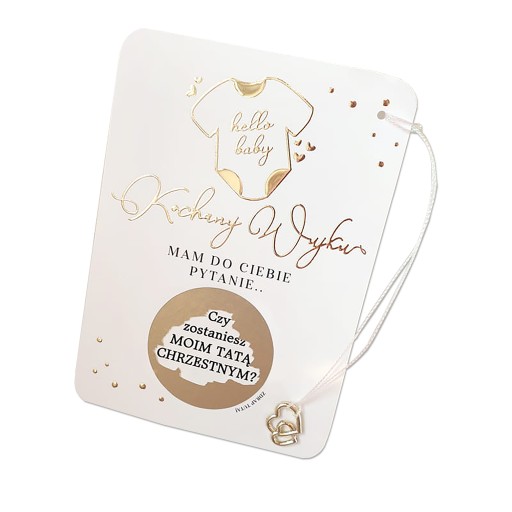 Karta ze zdrapką to pomysłowa forma, aby poprosić bliską osobę, aby została Ojcem Chrzestnym dziecka. Karta posiada piękne, złote tłoczone zdobienia.
