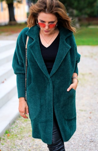 - Płaszcz z ALPAKI zapinany jest na duży nap na wysokości splotu;