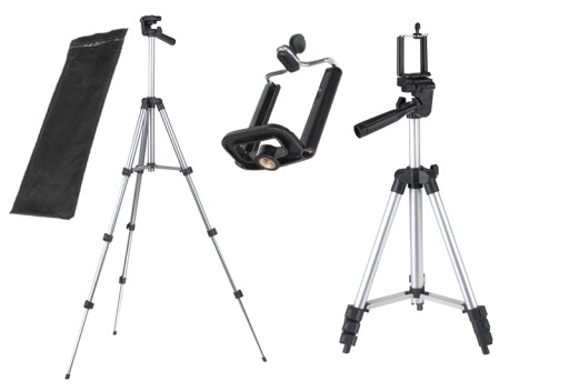W zestawie znajduje się lekki i bardzo poręczny statyw fotograficzny z głowicą zakończoną standardowym gwintem 1/4 cala oraz kompatybilny uchwyt do telefonu.