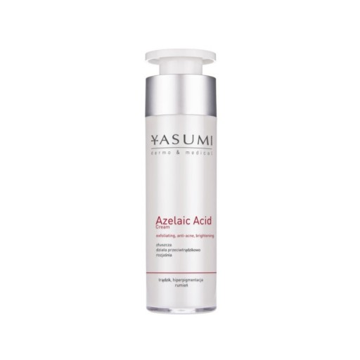 Specjalistyczny krem z kwasem azelainowym o działaniu złuszczającym, oczyszczającym i biostymulującym. Posiada właściwości przeciwbakteryjne, przeciwzapalne i rozjaśniające przebarwienia. Przeznaczony również dla skóry wrażliwej, z objawami trądziku różowatego oraz skłonnością do rumienia i podrażnień. Kwas azelainowy - główna substancja aktywna kremu, działa na bakterie Propionibacterium acnes powodujące trądzik, redukuje objawy zmian zapalnych, dokładnie oczyszcza skórę, redukuje liczbę zaskórników i zapobiega ich powstawaniu przez zwężanie rozszerzonych ujść gruczołów łojowych. Niacynamid redukuje krosty i zaskórniki, reguluje wydzielanie sebum, łagodzi rumień, ujednolica koloryt skóry. Stymuluje również syntezę kolagenu, zwiększa produkcję ceramidów przyczyniając się do poprawy funkcjonalności i integralności bariery skórnej. Alfa arbutyna działania depigmentacyjnie, reguluje produkcję melaniny oraz jej rozmieszczenie w naskórku. Regularne stosowanie YASUMI Azelaic Acid Cream sprawia, że skóra jest oczyszczona, przebarwienia są rozjaśnione, pory zwężone, a martwe komórki naskórka są usunięte. Preparat przygotowuje skórę do profesjonalnych zabiegów złuszczania, dodatkowo wzmacniając i utrwalając rezultaty tych zabiegów.