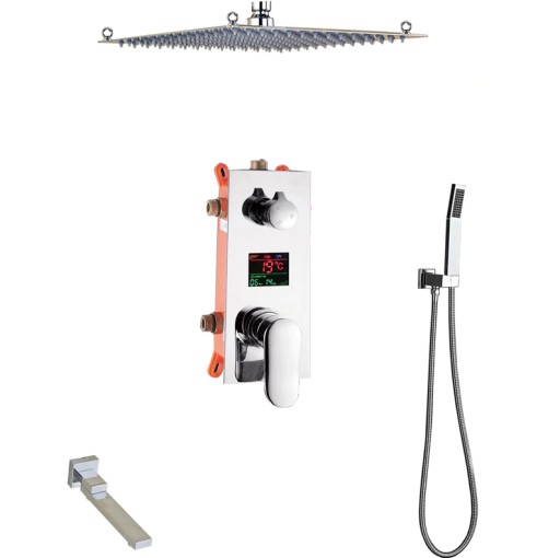 Stylowy i nowoczesny zestaw prysznicowy podtynkowy z deszczownicą z Led, obrotową wylewką, słuchawką prysznicową i wyświetlaczem.