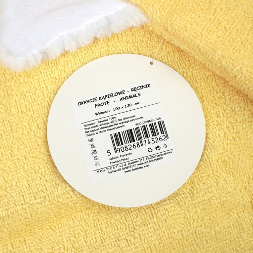 - Na całym obwodzie ręcznika i kapturku znajduje się lamówka, dzięki temu ręcznik nie będzie się strzępił