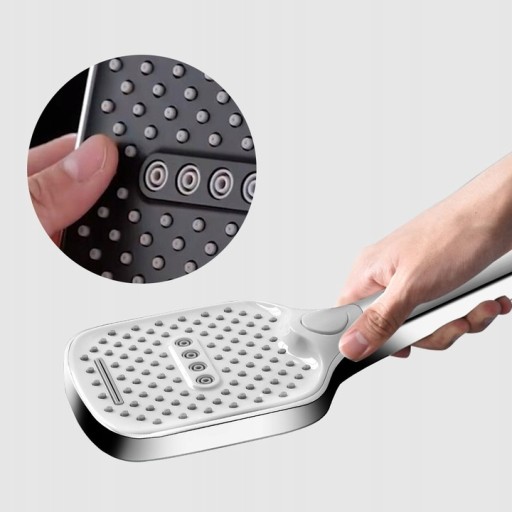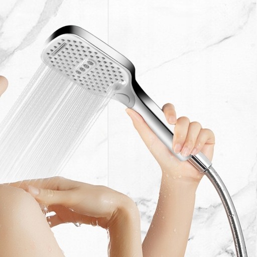 Trzyfunkcyjna, prostokątna słuchawka prysznicowa w zestawie z wężem oraz uchwytem ściennym. Wykonana została z twardego i wytrzymałego tworzywa, pokrytego warstwą chromu.
