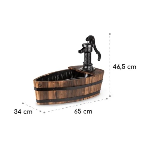 Solidną drewnianą wannę w kształcie łodzi wieńczy ozdobna pompka obrotowa wykonana z lakierowanego na czarno żeliwa. Wanna fontanny ogrodowej wykonana jest z pięknie uziarnionego drewna jodłowego i została poddana starzeniu wizualnemu poprzez obróbkę płomieniem. Aby woda pozostała bezpiecznie w pojemniku, a drewno było chronione przed gniciem, od wewnątrz wyłożono wkładkę do stawu.