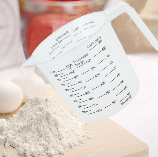 - Miarka z uchwytem i wylewką. Posiada miarki odpowiednie dla cieczy, cukru, mąki, oleju, maku, ryżu.