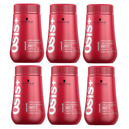 W skład zestawu wchodzi 6 opakowań pudru Schwarzkopf Osis Dust It, każde o pojemności 10g.